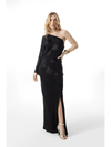 Long Black dress Mel by NERIAGE a striking piece that fuses sensuality with refined artistry. This long dress features an asymmetrical design with a single long sleeve and one shoulder exposed, enhanced by a diagonal neckline. A daring side slit adds movement, while the open back with thin straps creates allure. Subtle black vinyl floral applications enrich the fabric with texture and depth.